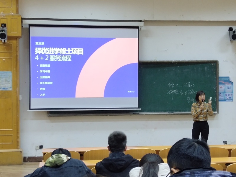 讲座现场,何老师表示,出国留学已成为当今大学生成长发展的一种趋势,同学们要提升自己的国际视野,开拓眼界,增长知识,以更好的面貌服务社会。何老师的分享主要包含赴日留学准备、日本研究生申请等,内容涵盖升学途径、日本名校学群、日本大学性质和国公私立大学特点、中日大学层级对照、以及申请要求等方面。在讲述日本研究生申请事项时,何老师先对“日本研究生定义、教授内诺制和修士考试”进行了详细解析,帮助大家了解日本修士/博士的升学制度。之后,何老师针对“日本研究生申请要求”进行了说明,从院校背景、、日语成绩、英语成绩4个维度进行解析。另外,还为有短板的学生提出了解决方案—“科研/实习/论文”,帮助学生从不同角度提升自己的软硬件背景实力。最后,何老师进行了总结,她希望同学们尽早明确目标,科学规划,以实现自己的人生理想。