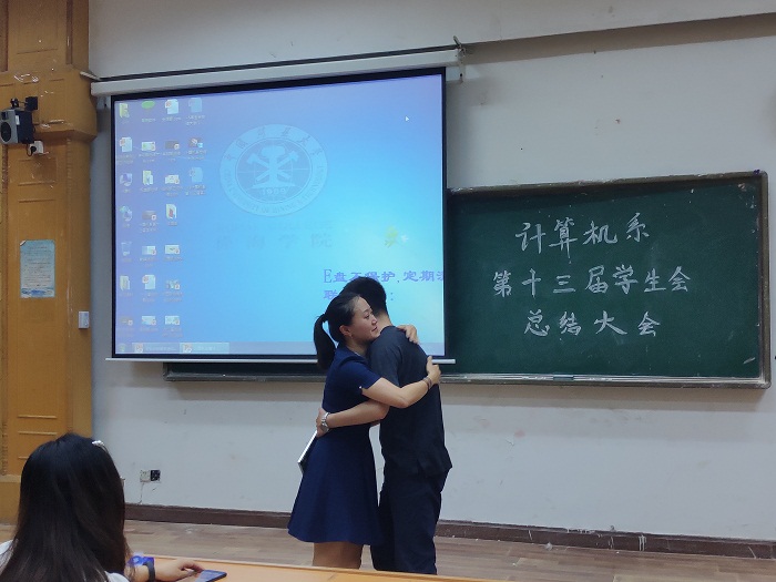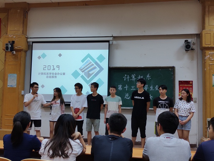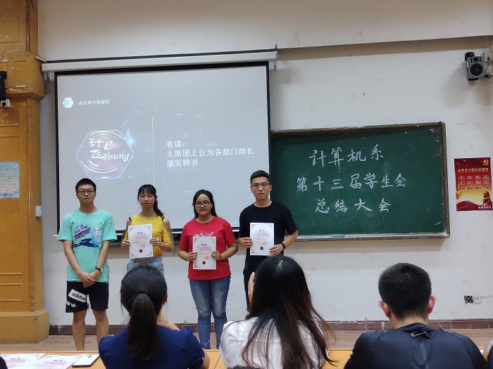 大会开始,主持人邀请杨轩老师上台讲话,杨轩老师对于第十三届学生会给予高度肯定,也指正了各部门工作中存在的不足,勉励学生会成员再接再厉,将计算机系学生会越办越好。接下来各部门依次上台总结自己一年在学生会工作中的收获。一年中,他们风雨并行,从稚嫩到成熟,从懵懂到熟练,学生会的每一位老师和学长学姐们都在他们背后默默地引导,关注他们在成长中的跌倒与站起,让学生会的每一位成员快速地成长为优秀的大学生,也为计算机系不断增添荣耀。接着,骆春铃老师赞扬在座的每一位学生的付出:“第十三届学生会的每一位成员对于学生会的大家庭中是必不可少的,我们一起战斗过,一起承受过失败,也一起欢呼喜悦,感谢每一位成员的付出。”总结汇报完毕,学生会对于辛勤付出在第一线的各位部长们进行表彰,学生会主席团为他们颁发聘书并合影留念。