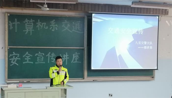 为了广泛传播交通安全知识,培养学生良好的交通安全意识,强化学生自我保护能力,从而更好地打造平安校园。2019年3月29日下午2点30分,徐海学院计算机系于主东一开展了道路交通安全讲座。本次讲座到场的嘉宾有交警大队穆孝第警官,计算机系学生会主席席柯,副主席叶紊、赵轩。