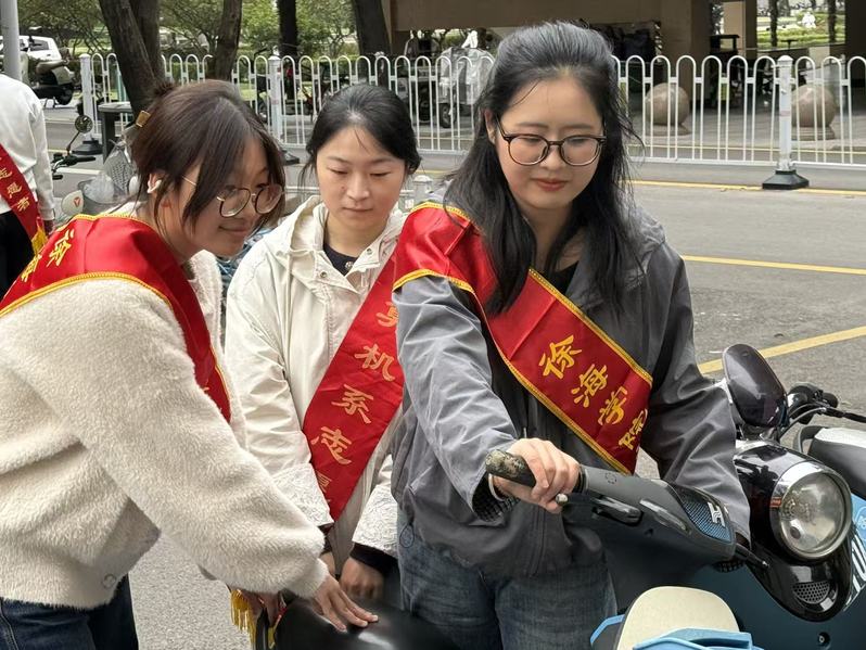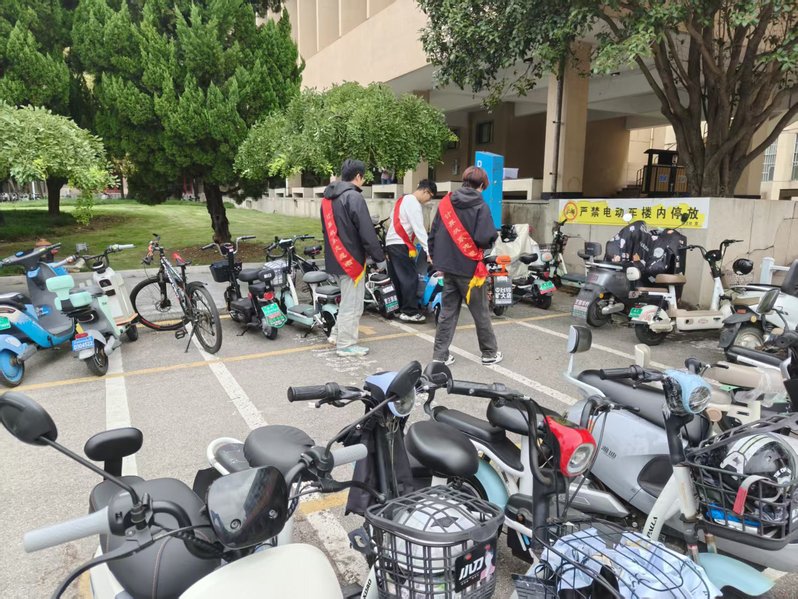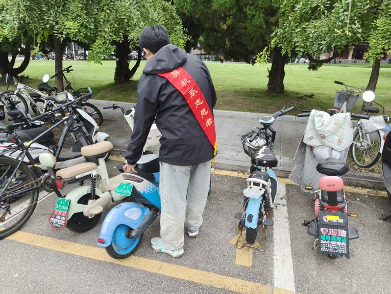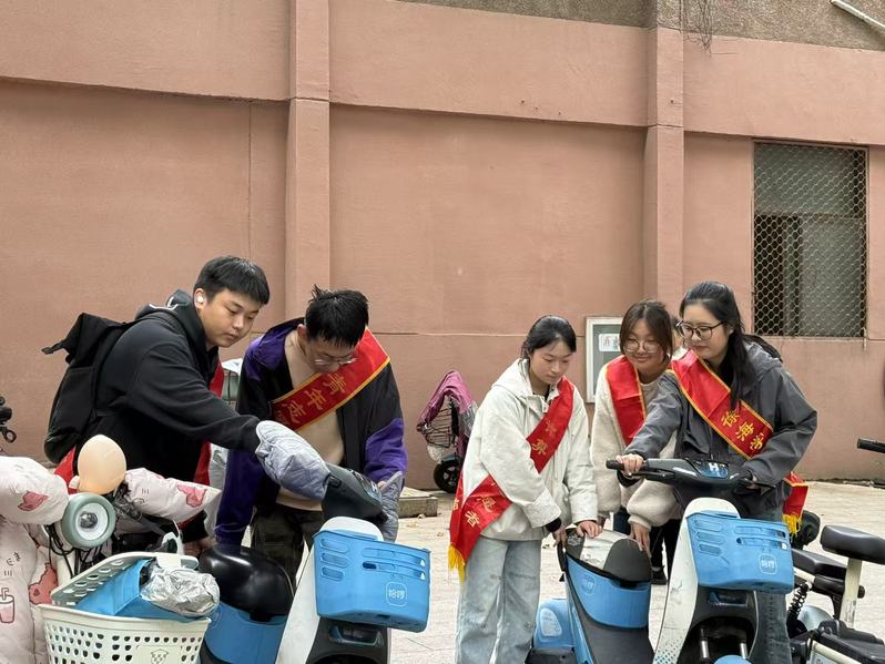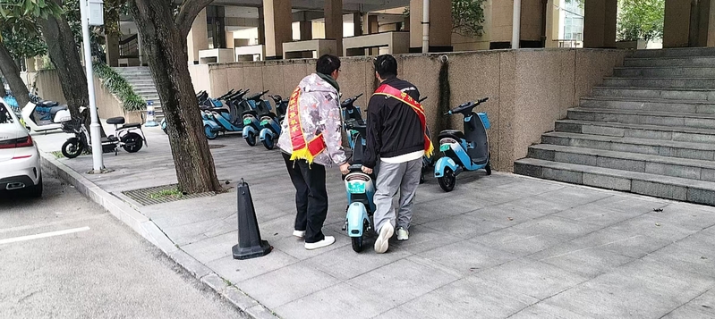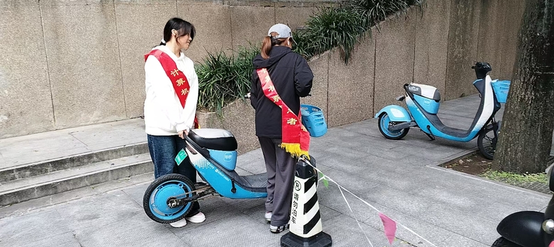 活动中,志愿者们分工协作、默契配合,依照“整齐划一、方便取用、不占盲道”的原则,将分散在各处、东倒西歪的共享单车搬运至指定停放区域,逐一扶正摆齐。同时,志愿者们还向过往同学宣传文明停放共享单车的重要性,耐心讲解规范停车的具体要求,以真诚的态度和实际行动感染着每一位同学。在志愿者们的努力下,校园内共享单车乱停乱放的现象得到明显改善,原本杂乱的停放区域变得井然有序,为同学们出行营造了更舒心的环境。