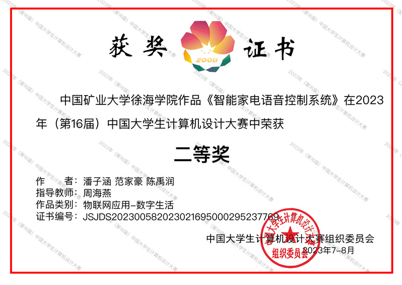 项目《智能家电语音控制系统》由计算机系周海燕老师指导,2020级物联网工程专业潘子涵、范家豪、陈禹润三位同学组成团队。该项目旨在利用物联网技术对智能家电提供便捷化的语音控制,创新之处在于其智能化和便捷性。本作品可以通过语音识别控制常用的家电,可应用在多个不同的场景,操作简便,可以为用户提供更加智能、温馨、便捷的交互式服务。比赛过程中,参赛队员通过详细的演示和清晰的说明,向评委展示了项目的功能和优势。评委对项目的创新思维和实用性给予高度评价。